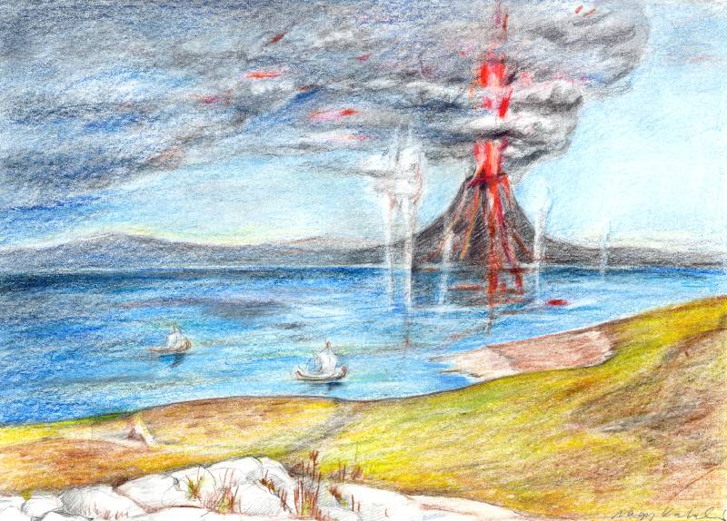 Ilyen lehetett a bronzkori kitörés az ősi Thérán Manganari öböl felől nézve (Iosz sziget, a szerző felvétele alapján, NK)