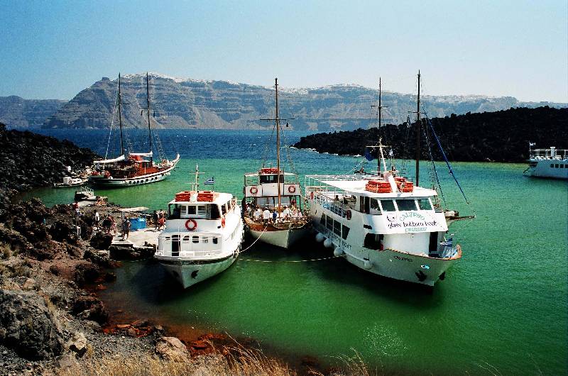 A kén és a vas sárgára festette a vulkáni öböl vizét (Nea Kameni, sz)