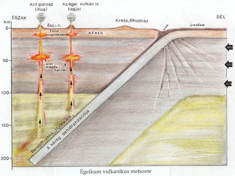 Az Égeikum alatt a földkéregben pokoli erők dolgoznak. Afrika lemeze Európa alá nyomul; a súrlódás megolvasztja az anyagot és kialakulnak a vulkáni magma kamrák. (Hédervári után NK)