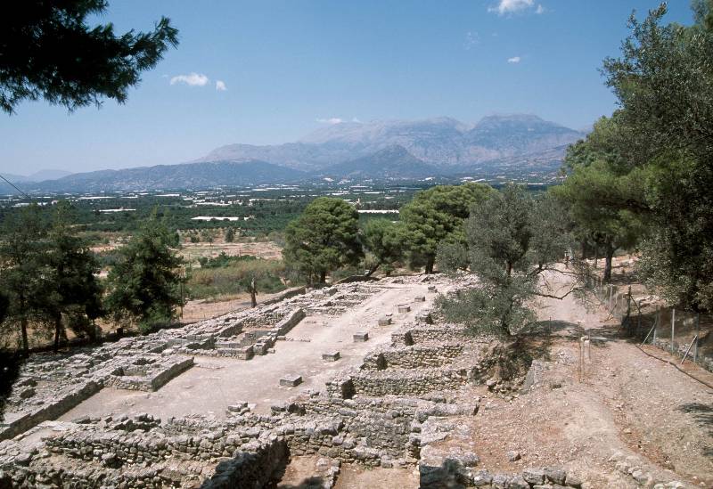Agia Triada egykori üzletsorának maradványa; mindegyikhez nyitott oszlopos előcsarnok tartozott (Kréta, sz)