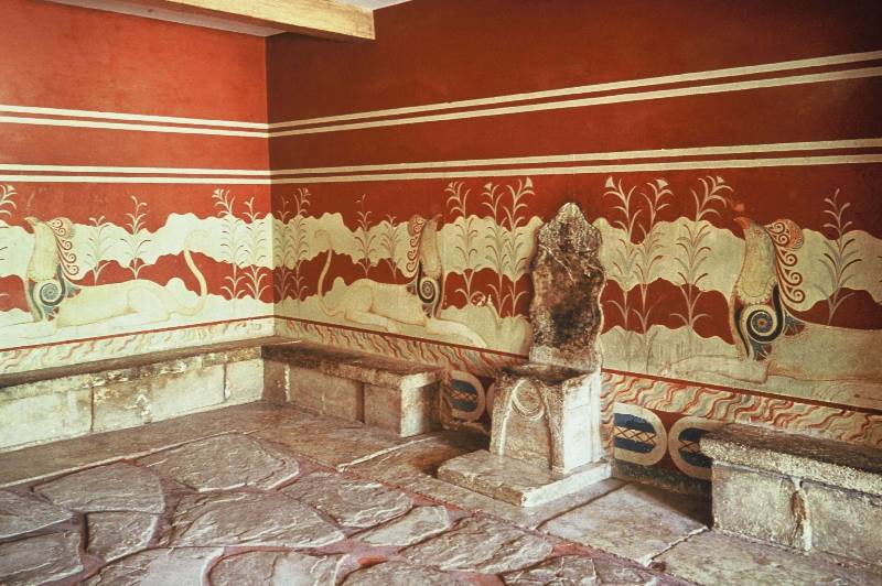 A knósszoszi palota tróntermében állt a királynő alabástromból készült széke. E trónon ülhetett a papkirálynő, akit két oldalról a minószi kor szent állatai; a griffek és növények freskói őriztek. (Kréta, sz)