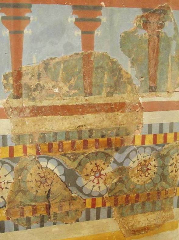 Evans a Knósszoszban talált „Rosette freskók” alapján állította helyre a palota oszlopait (Iraklion, Knósszosz, AMI, sz)