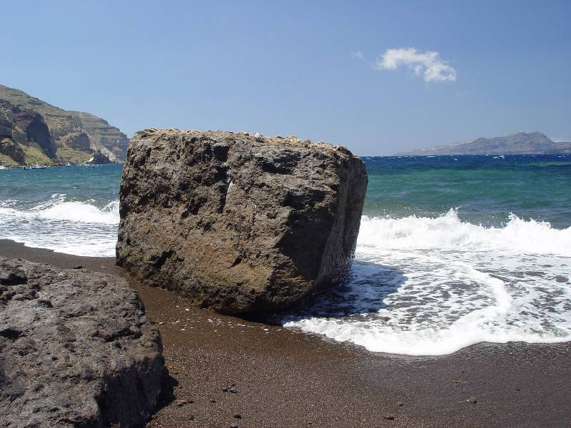 Szantorini déli oldalán a kaldera elvékonyodik, mintha ide kevesebb vulkanikus anyag hullott volna. Honnan került ide ez a több tonnás lávából faragott szabályos kockakő? (Szantorini, sz)