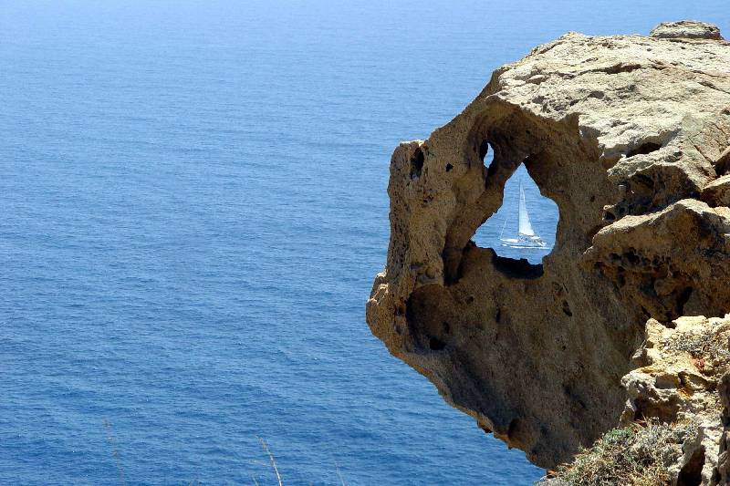 Akrotiri fok „kékablaka” turista látványosság. A közelében fedeztem fel a Kréta felé tekintő óriási sziklaarcot. (Szantorini, sz)