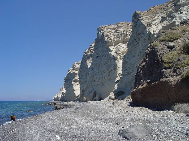 A vulkanikus partoldalt átformálta az északi szél és a téli eső. A távolban Iosz sziget látszik. (Szantorini ÉK; Orihia, sz)
