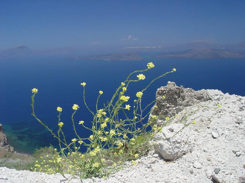 Az Akrotiri-fok közelében a fehér horzsakőben virágok pompáznak (Szantorini, sz)