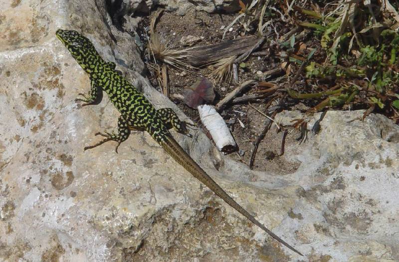 Ősök által faragott kő egy gyík és egy csikk társaságában (Málta, Gozo, sz)