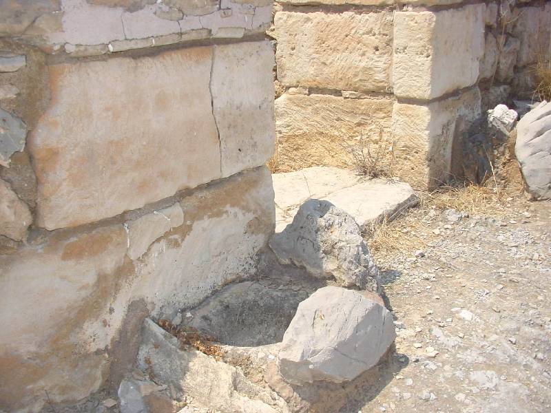 A középső szentély bejáratától balra egy kis edénybe gyűjtötték az áldozat vérét (Kréta, Anemoszpilia, sz)