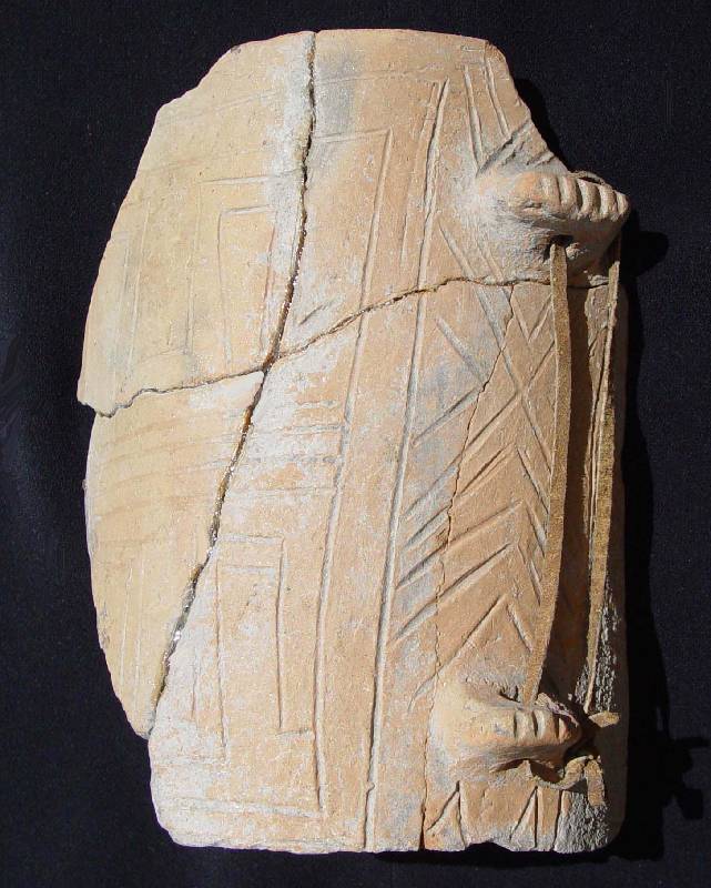 Hengeres edény teljes profilú töredéke, karcolt meander dísszel és egymás alatt átfúrt bütykökkel (Kéthalom, Királydomb, »Kalicz«, szt)